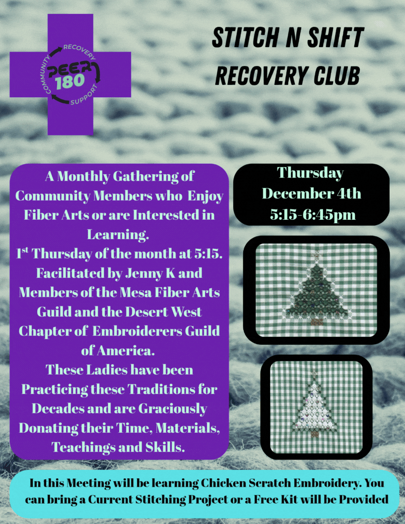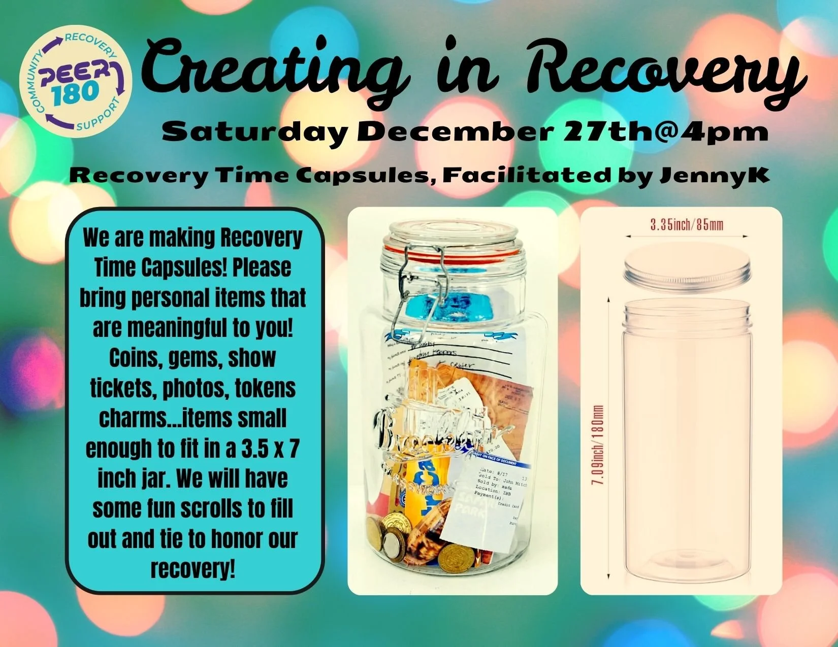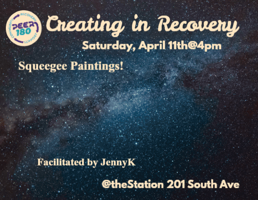 Creating in Recovery or CIR works to bring the community of those in recovery together, with their supporters and family members, for an artistic experience. We have found that being creative increases a sense of well being, precense, and community. Engaging in art is a pathway to having healthy conversations with ourselves and supports our self-esteem and learning processes. Peer 180 provides all materials needed for these classes.