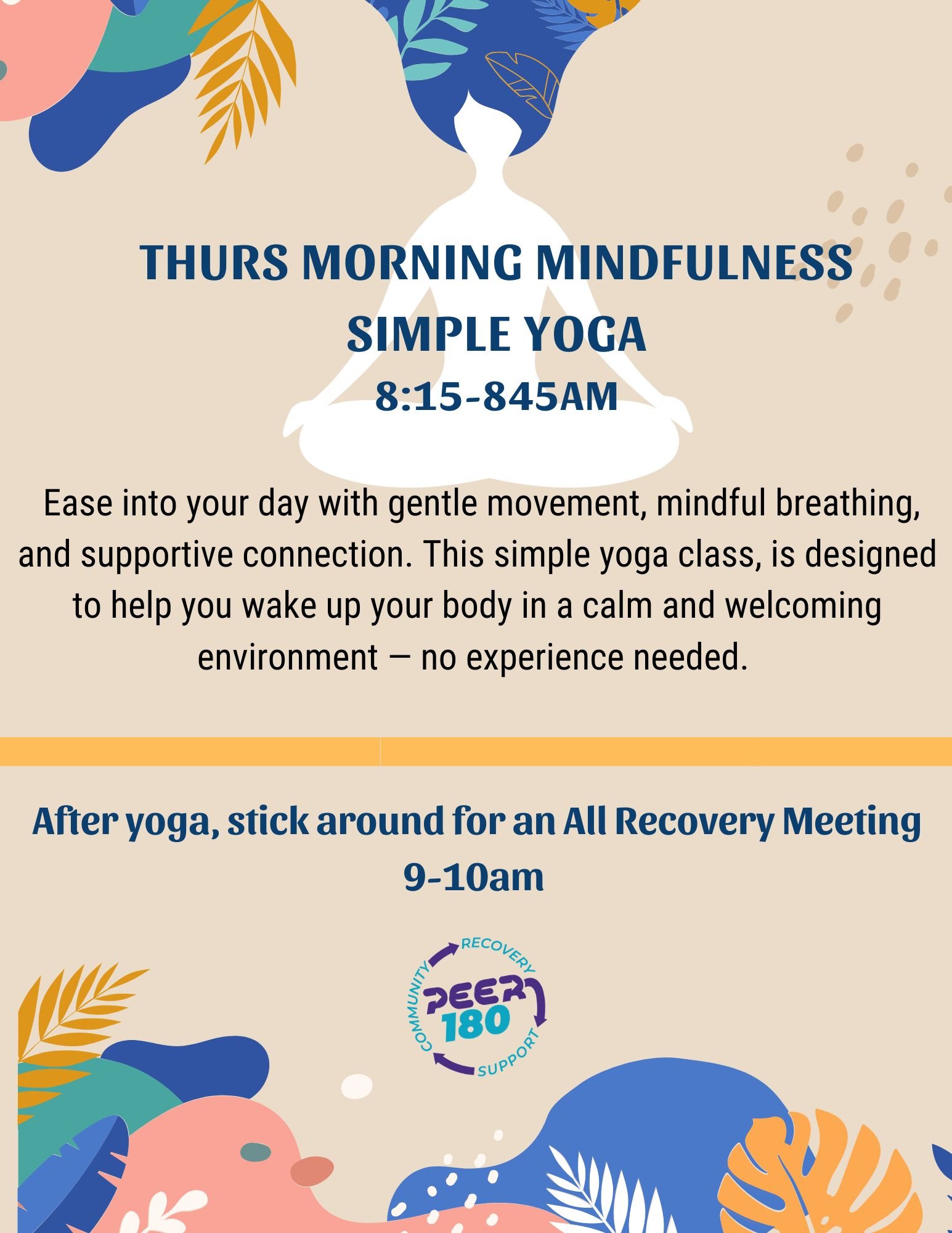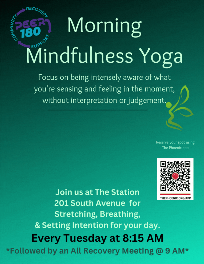 Morning Mindfulness is gentle Yoga and stretching. We take the time to start our day with the goal of being present, grateful, and focused on our intentions. We help guide you through a morning routine that promotes not only intention, but kindness and awareness of ourselves and others. This program aims to support individuals in growing positive mindsets to help ourselves and others face the daily challenges that recovery brings. Morning Mindfulness sessions are thirty minutes long and followed directly by an All Recovery Meeting.